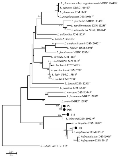 Figure 3 shows phylogenetic trees constructed using P7, P8, P15, and P16 strains based on evolutionary distances determined by the neighbor-joining method, and these 4 strains were set in the Lactobacillus cluster, while strains P7 and P16 were identified as L. reuteri with 100% bootstrap values, and P15 and P8 were assigned to L. johnsonii and L. amylovorus species, respectively, both supported by 100% sequence similarities and bootstrap values.