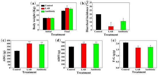 Effects of selected LAB strains and antibiotic on growth performance in weaned piglets. Control group, basal diet (N = 30); LAB group, basal diet + 6% mixed selected LAB strains (N = 30); antibiotic group, basal diet + 150 mg/kg of aureomycin (N = 30). (a) Body weight (Kg), (b) diarrheal incidence (%), (c) ADG (g), (d) ADFI (g) and (e) F:G (g/g). ADG, average daily gain; ADFI, average daily feed intake; F:G, feed:gain ratio. Asterisks denote significant differences compared with the control group (* p < 0.05, ** p < 0.01).