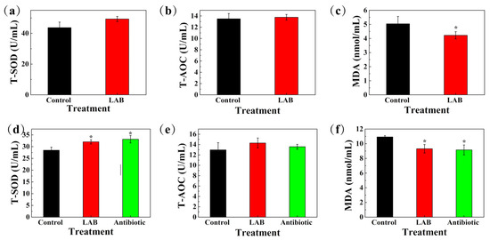 Effects of LAB on antioxidant capacity of serum in sows and weaned piglets. (a,d) T-SOD (U/mL), (b,e) T-AOC (U/mL), (c,f) MDA (nmol/mL), are antioxidant capacity of serum in sows and weaned piglets, respectively. For sows, control, basal diet (N = 18); LAB, basal diet + 6% mixed selected LAB strains (N = 18). For piglets, control, basal diet (N = 30); LAB, basal diet + 6% mixed selected LAB strains (N = 30); antibiotic, basal diet + 150 mg/kg of aureomycin (N = 30). T-SOD, total superoxide dismutase; T-AOC, total antioxidant capacity; MDA, malondialdehyde. Asterisks denotes significant differences compared with the control group (* p < 0.05).