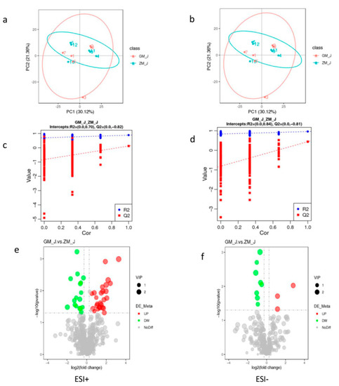 The PCA values (Figure 1a,b) and the PLS-DA results (Figure 1c,d) showed that the skeletal muscle of SND and HFD rabbit groups differed from each other. The values of the model quality parameters for skeletal muscle were R2 = 0.84 and Q2 = −0.81 for the positive model data (Figure 1c) and R2 = 0.70 and Q2 = −0.82 for the negative model data (Figure 1d). These results showed that the PLS-DA model had a good predictive ability and there was no overfitting.