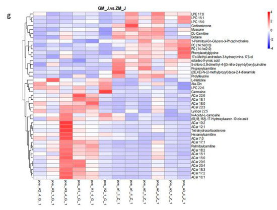 Skeletal muscle metabolite score and permutation test of rabbits in normal and high-fat diet groups. (a,b), PCA score graph between normal and high-fat diet groups; (c,d), permutation test from PLS-DA models; (e,f), volcano of metabolites with significant differences between normal and the high-fat diet groups; (g) is the clustering heat map of differential metabolites between normal and the high-fat diet groups. Note: ESI+: cationic mode; ESI-: Anion mode; GM: High fat group; ZM: Normal group.