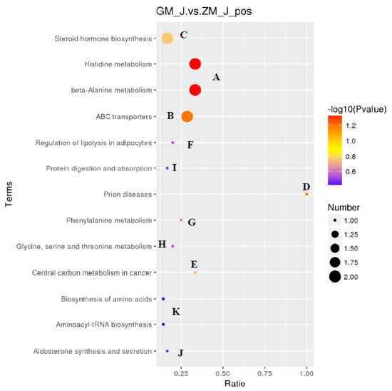 Disturbed pathways in response to a high-fat diet. A. Histidine metabolism and beta-Alanine metabolism; B. ABC transporters; C. Steroid hormone biosynthesis; D. Prion diseases; E. Central carbon metabolism in cancer; F. Regulation of lipolysis in adipocytes; G. Phenylalanine metabolism; H. Glycine, serine and threonine metabolism; I. Protein digestion and absorption; J. Aldosterone synthesis and secretion; K. Aminoacyl-tRNA biosynthesis and biosynthesis of amino acids.
