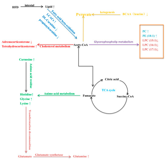With the rapid development of the economy and society, great changes have taken place in the way of the human diet. It seems that the consumption of high-fat foods has become a normal part of life, which brings about many related diseases to the body. The most common is chronic metabolic disease, including obesity, hyperlipidemia, hypertension, and diabetes. The basic characteristics of these chronic diseases are alterations to the TCA cycle, blocked glucose-fatty acid cycle, elevated rates of lipolysis, and impaired glucose homeostasis, making the body unable to effectively absorb and store energy, resulting in metabolic disorders of the body [1,2]. However, diet is considered to be the most important factor leading to metabolic disorders [3,4].
