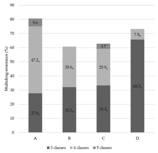 Distribution of multidrug resistance of 185 high-level aminoglycoside-resistant Enterococcus faecalis isolated from the bulk tank milk of four dairy companies. Values without the same subscript letter (a,b) differ significantly (p < 0.05).
