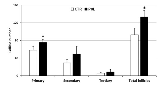 Polyphenols increased (p < 0.05) the number of primary and total follicles in the POL group, while the number of secondary and tertiary follicles were unaffected (Figure 1).