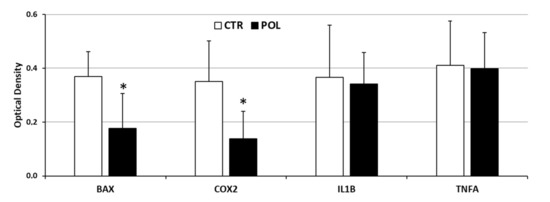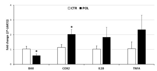 Higher expression levels of COX2 (p < 0.05) were observed for the POL group than the CTR group, while BAX expression was lower (p < 0.05) in POL compared to CTR (Figure 4). No differences were observed in IL1B and TNFA gene expression between the CTR and POL groups (Figure 4).
