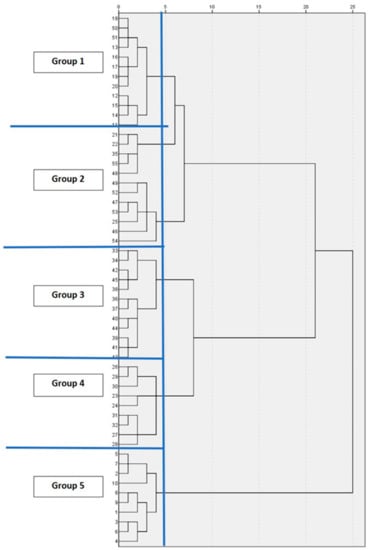The cluster analysis established five groups to identify farm categories: groups 1–3 (G1, G2, G3) with 12 farmers in each group, group 4 (G4) with 9 farmers, and group 5 (G5) with 10 farmers (Figure 2).