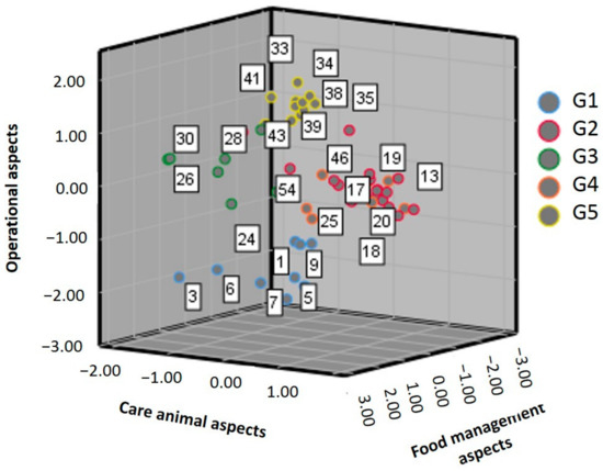 Figure 3 shows the distribution of farms in the rural sectors of Jipijapa considering the three dimensions corresponding to the MCA factors and contrasted with the five identified groups or clusters, which showed that backyard pig farming was found to be primarily an operational activity, linked to the families’ welfare and to the management of the production system, where food times and forms were the outstanding aspects in the breeding of pigs. The greatest homogeneity linked with the three factors was found in G2 and G5 groups, while G1, G3, and G4 groups had a higher dispersion of data, G3 and G5 were diverted to the social welfare dimension (F1), G1 was positioned toward the dimension of caring for pigs, and G2 and G4 were more geared toward the factor explaining food and fattening practices (F3). The last factor has crucial importance to the sustainable pig production systems of Jipijapa by taking advantage of the remains of agricultural crops in the area to fatten the pigs.