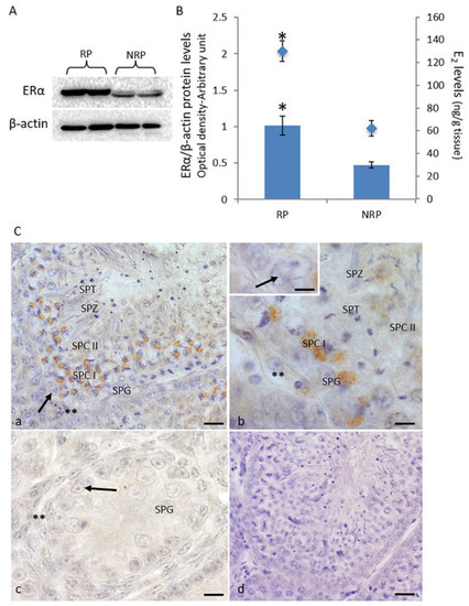 (A) Western blot detection of ERα in quail testis during reproductive and non-reproductive periods. A specific band of 66 kDa was detected. (B) The amount of protein was quantified using the ImageJ program and normalized with respect to β-actin protein. The values presented represent the means ± S.D. of the values obtained for five animals (two bands were shown). * p < 0.05. RP, reproductive period; NRP, non-reproductive period. (C) Immunohistochemical localization (brown areas) of ERα. (a,b) Reproductive period. The signal is evident in Leydig cells (**), spermatocytes I (Spc I) and II (Spc II), spermatids (Spt), and spermatozoa (Spz). No signal is evident in Sertoli cells (arrow) and spermatogonia (Spg). (c) Non-reproductive period. The signal is evident in Sertoli cells (arrow). No positivity was observed in Leydig cells (**) and spermatogonia (Spg). (d) Control section. Scale bars correspond to 5 µm in (a,c,d) and 10 µm in (b).