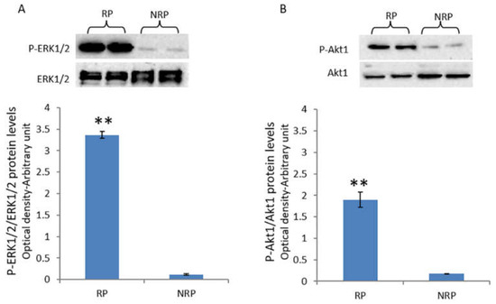 Expressions of P-ERK1/2 and P-Akt-1 in quail testis during reproductive and non-reproductive periods. (A) Detection of P-ERK1/2 protein using Western blot analysis. A specific band of 42 kDa was detected. The amount of phosphorylated ERK1/2 was quantified using the ImageJ program and normalized with respect to ERK1/2. The values presented represent the means ± S.D. of the values obtained for five samples (two bands were shown in the upper panel). ** p < 0.01. (B) Western blot analysis for Akt-1 protein in quail testis during reproductive and non-reproductive periods. A specific band of 60 kDa was detected. The amount of phosphorylated Akt-1 was quantified using the ImageJ program and normalized with respect to Akt-1. The values presented represent the means ± S.D. of the values obtained for five samples (two bands were shown). ** p < 0.01. RP, reproductive period; NRP, non-reproductive period.