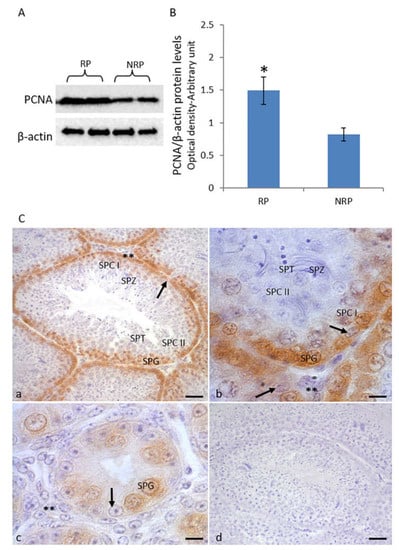 (A) Western blot analysis of testicular PCNA expression in quail during reproductive and non-reproductive periods. A specific band of 36 kDa was detected. (B) The amount of PCNA was quantified using the ImageJ program and normalized with respect to β-actin. The values presented represent the means ± S.D. of the values obtained for five samples (two bands were shown). * p < 0.05. RP, reproductive period; NRP, non-reproductive period. (C) Immunohistochemical localization (brown areas) of PCNA. (a,b) Reproductive period. The signal is evident in spermatogonia (Spg), spermatocytes I (Spc I), and Sertoli (arrow) cells. No signal is evident in Leydig cells (**), spermatocytes II (Spc II), spermatids (Spt), and spermatozoa (Spz). (c) Non-reproductive period. The signal is evident only in spermatogonia (Spg). No positivity was detected in Leydig cells (**) and Sertoli cells (arrow). (d) Control section. Scale bars correspond to 5 µm in (a,c,d) and 10 µm in (b).