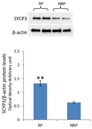 Western blot detections for SYCP3 in quail testis during reproductive and non-reproductive periods. A specific band of 33 kDa was detected. The amount of protein was quantified using the ImageJ program and normalized with respect to β-actin protein. The values presented represent the means ± S.D. of the values obtained for five animals (two bands were shown). ** p < 0.01 for reproductive period vs. non-reproductive period. RP, reproductive period; NRP, non-reproductive period.