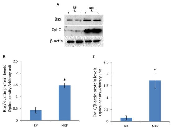 Bax and cytochrome c protein levels in quail testes during reproductive and non-reproductive periods. (A) Western blot analysis for Bax (23 kDa) and cytochrome c (14 kDa) proteins in quail testis during reproductive and non-reproductive periods. The amounts of Bax (B) and cytochrome c (C) were quantified using the ImageJ program and normalized with respect to β-actin. The values presented represent the means ± S.D. of the values obtained for five samples (two bands were shown). * p < 0.05 for reproductive period vs. non-reproductive period. RP, reproductive period; NRP, non-reproductive period.