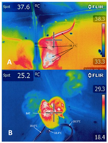 Thermograms of mole-rats subjected to (A) heat and (B) cold. Clearly, under hot ambient temperatures, the body’s entire surface presents a temperature above 33.3 °C, with a maximum of 38.3 °C on the face, back, and tail. In contrast, in a cold environment (B), the tail and pelvic limbs present a surface temperature of 18.4–18.6 °C, with a maximum of 29.3 °C in the head, eyes, and back. Observations show that heat distribution differs depending on the stimulus. In warmer environments, the zones with greater heat are the eyes, head, back (the prescapular zone where brown adipose tissue (BAT) is stored), and tail; while under cold conditions, heat concentrates in the eyes, head, and the first part of the back. Thermogram A shows the mechanism of peripheral cutaneous vasodilation under high temperatures, which increases heat transfer towards the environment, while thermogram B illustrates the mechanism of peripheral cutaneous vasoconstriction, visible on the pedal surfaces and tail, at low temperatures. This mechanism conserves heat in the organism’s core region to protect its vital organs [54]. The images also show that the tail and feet are key organs for conserving and dissipating heat in two thermally distinct environments. These findings agree with McGowan et al.’s report on mole-rats [53]. The animals shown in the thermograms were subjected to ambient temperature changes for only 30 min, following Mexican regulations for the care and use of experimental animals. (Images obtained with an FLIR E 50 camera equipped with an 18-mm FOL lens at a resolution of 240 × 180 pixels, (emissivity = 0.95, distance = 0.5 m)).