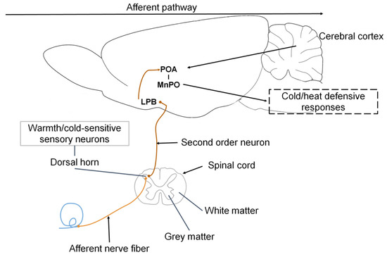 General mechanism of physiological thermoregulation in mammals. This process begins when the organism’s thermoreceptors in the skin detect a temperature change, either environmental or internal. Upon detecting the new temperature, those thermoreceptors transmit a signal through afferent nerve fibers to the dorsal horn of the spinal cord, where warm/cold-sensitive sensory neurons are activated. These neurons, in turn, transmit a response that consists of a nerve impulse sent to the lateral parabrachial nucleus (LPB) [63]. This triggers a reaction in the preoptic area (POA) of the hypothalamus—a structure considered responsible for thermoregulation in mammals [64]—specifically, the median preoptic nucleus (MnPO) [8]. After that, cold- or heat-defensive responses are initiated through efferent pathways [1].