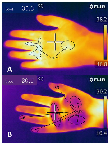 Thermograms of a hand subjected to (A) heat and (B) cold for 30 s. These images show that in response to a hot stimulus, a larger area of the palm presents a temperature of 36.3 °C with a maximum of 38.2 °C in the center and around the proximal and distal transverse creases. In contrast, in response to a cold stimulus, most of the palm—marked with ellipses—and the fingers present a temperature around 20.3 °C, while only the wrist, the center of the palm, and a small area of interdigital spaces have a maximum of 30.2 °C. Observations show that heat is distributed across almost the entire surface of the palm in response to a hot stimulus due to heat-induced vasodilatation. In response to a cold stimulus, in contrast, the surface temperature decreases, and heat concentrates in strategic points due to peripheral vasoconstriction. (Images obtained with a FLIR E 50 camera with an 18-mm FOL lens at a resolution of 240 × 180 pixels, (emissivity = 0.95, distance = 0.5 m)).