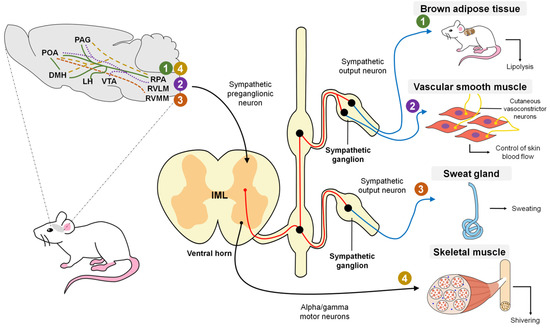 The column of IML cells has projections to the rostral ventromedial medulla (RVMM), which correlates to sweating in cats and humans [93]. Currently, the stimulation pathways between the RVMM and POA are not entirely known, so they are still under study [8] (Figure 4).