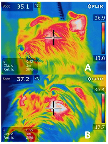Thermograms of an idle dog (A) vs. a dog doing exercise (B). During repose (A), the ocular temperature was 35.1 °C, compared to image (B showing an ocular temperature of 37.2 °C in a dog after 15 min of exercise. (Obtained with an FLIR E 50 camera with an 18-mm FOL lens at a resolution of 240 × 180 pixels, (emissivity = 0.95, distance = 1 m)).