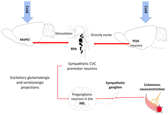 In response to cold, the sympathetic nerve fibers that innervate the cutaneous vasculature are activated, causing cutaneous vasoconstriction that (i) reduces heat transfer with the environment and (ii) conserves heat in the center of the organism’s body [54] (Figure 1). A study with rats by Tanaka et al. [112] indicated that the neurons of the median preoptic nucleus (MnPO) play an essential role by triggering the action of the sympathetic cutaneous vasoconstrictor (CVC) nerve fibers. Those authors observed that inhibiting the MnPO neurons by microinjections of GABA caused vasoconstriction in the tails of mice (Mus musculus) due to the increased activity of the sympathetic CVC nerve fibers. The optogenetic activation of the glutamatergic neurons in the MnPO by channelrhodopsin 2 increases vasodilatation in the tail [106,113]. The above suggests that an output from the MnPO inhibits the sympathetic CVC nerve fibers. Excitation of the rostral raphe pallidus (rRPA) also increases vasoconstriction and reduces the cutaneous temperature of the tail (Figure 1), while its inhibition blocks vasoconstriction [8].
