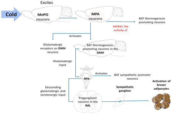 Neurophysiological mechanism for developing the BAT thermogenesis response. Detection of cold excites the neurons of the median preoptic nucleus (MnPO), which inhibits the activity of a group of neurons in the medial preoptic area (MPA) whose function is to suppress the activity of brown adipose tissue (BAT) thermogenesis-promoting neurons. The inhibition of said neurons and excitation of the glutamatergic receptors of the neurons in the dorsomedial hypothalamic nucleus (DMH) activate the BAT thermogenesis-promoting neurons in that structure. These neurons send a glutamatergic signal that activates the BAT sympathetic premotor neurons in the raphe pallidus area (RPA), increasing the descending glutamatergic and serotonergic input to the intermediolateral cell column (IML). These are the substances that trigger BAT activation.