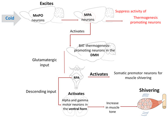 Madden and Morrison [54] mention that the thermogenic efferent pathway (Figure 4) involves an inhibitory output of the POA that affects the hypothalamic neurons in the dorsomedial hypothalamus. The thermogenesis-promoting neurons of the dorsomedial hypothalamic nucleus (DMH) activate premotor neurons in the raphe pallidus area (RPa) that, in turn, send a descending excitatory drive to the spinal neurons (sympathetic preganglionic neurons for BAT; motor neurons for shivering). In the case of cutaneous vasoconstriction, a similar pathway mediates the process. The difference lies in the fact that no relay in the DMH is required because the inhibitory output of the POA directly impacts the sympathetic premotor cutaneous vasoconstrictor neurons in the raphe. The following is a more detailed explanation of these two processes.