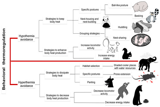 Animals are also capable of performing voluntary behaviors that alter their local thermal environment. These thermoregulating behaviors are carried out by endotherms (mammals and birds), reptiles, fish, and a high percentage of invertebrates that depend almost exclusively on behavioral elements to respond to external temperature changes. In addition to their antiquity, thermoregulating behaviors—at least those in mammals—are of the “motivated” type; that is, they occur in response to a motivation. For this reason, the temperature can be used as a reward to train animals to perform specific tasks, as in rats exposed to cold, who learn to press a button to turn on a heat lamp [14,15]. The above suggests that thermoregulating behaviors are driven by the same motivational system that preserves other behaviors—eating and drinking, for example—that arise in response to homeostatic needs [8]. Thermoregulating behaviors are divided into (i) those performed to prevent hypothermia and (ii) those carried out to prevent hyperthermia (Figure 10). The former includes strategies to conserve body heat, such as adopting certain postures (ball-like position) or basking under the sun, and nest-building, huddling, and nest-sharing. Other behaviors improve heat generation, for example, increasing locomotor activity and energy intake. Behaviors for preventing hyperthermia, in contrast, are based on strategies that dissipate heat, such as cold-seeking, shade-seeking, specific postures (exposure to wind, prone position/body extension, posting on rocks), moving the ears—in elephants [135,136]—and panting. Furthermore, actions that decrease heat generation, including lowering energy intake and locomotor activity [7]. Mammals perform these behaviors when exposed to severe thermal conditions in which their autonomous regulation loses effectiveness, and valuable body resources like water and energy could be compromised. In humans—and perhaps some other mammals—these behaviors focus on avoiding thermal discomfort [137]. Thus, requiring participation by emotion-related regions of the cerebral cortex and amygdala [138] activated by innocuous cutaneous thermal stimuli [1,139].