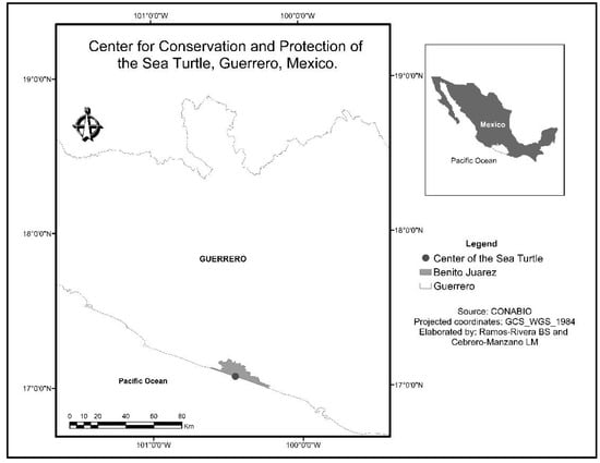 The fieldwork was carried out in Guerrero, Mexico, on the beach Llano Real where the Sea Turtle Conservation and Protection Center is located (coordinates 17°04′00.4′′ N, 100°26′56.8′′ W). This center is administered by the Universidad Autónoma de Guerrero (Figure 1).