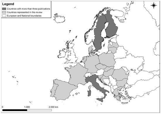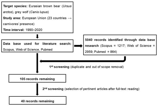 To answer these questions, from September to December 2020, we retrieved peer-reviewed English language scientific material published between 1990 and September 2020 addressing human–wolf/bear conflicts in EU countries. To do so, we used three comprehensive databases (Scopus, Web of Science, Pubmed). Only those countries that have a permanent and reproductive presence of at least one species or are affected by the occasional presence of a given species (e.g., animals in dispersal) without reproduction [12,48,49,50] (i.e., Austria, Belgium, Bulgaria, Croatia, Czech Republic, Denmark, Estonia, Finland, France, Germany, Greece, Hungary, Italy, Latvia, Lithuania, Netherlands, Poland, Portugal, Romania, Slovakia, Slovenia, Spain and Sweden) were included in the analysis. Likewise, those countries in which the presence of such predators (neither stable nor sporadic) has not been reported in recent years (i.e., Cyprus, Ireland, Luxemburg, Malta) [12,48,49,50] were excluded. The United Kingdom, despite being part of the EU up to 2019, was excluded from the analysis as these carnivores were eradicated there well before 1990 [12]. The literature search was carried out using the following research string: conflict* OR attack* OR predation OR damage* AND management OR retaliation OR kill* OR poach* OR mortality OR cull* OR control OR mitigation OR prevention OR attitude OR perception OR compensation AND wild* OR predator OR carnivore* OR bear* OR wolf OR wolves AND zootechny* OR husbandry OR transhumance OR extensive OR graze* OR rural OR rangeland OR farm* OR pasture* OR livestock OR cattle OR sheep OR goat*. The inclusion of “*” was made to include all the possible variations of the word considered (e.g., cull* ⟶ cull, culling, culled). With this screening, we were left with 5040 publications (1217 from Scopus; 2959 from Web of Science; 864 from Pubmed). We then manually screened the remaining publications to identify studies that dealt with depredation on livestock species (cattle, sheep, goats) to evaluate stakeholders’ attitude towards both wolves and bears. In those studies (e.g., Swedish ones) in which the attitude towards a larger range of predators (e.g., bear, wolf, lynx, wolverine) was evaluated, we considered only data referring to bears and wolves. The same criteria were used for the different husbandry species (e.g., sheep, reindeer) mentioned in the research. In such cases, only information related to the target livestock species was included in the research (i.e., sheep). In those studies in which stakeholders’ attitude was evaluated in more countries all belonging to the EU (e.g., Italy and Greece), we discerned the information reported in both areas (i.e., attitudes for Italy and attitudes for Greece). On the contrary, in those studies in which the attitude of the different stakeholder categories was evaluated in more countries not all belonging to the EU (e.g., Norway and Sweden), we considered only the information reported in EU countries (i.e., Sweden). After removal of duplicates, articles that included either livestock or carnivore species not pertinent to the present research and articles whose topic was out of our scope (e.g., those dealing with human–carnivore conflicts but not referring to stakeholder perceptions), the potential sample was reduced to 40 pieces of scientific research (Table 1; Figure 1). Countries included in the review are shown in Figure 2.