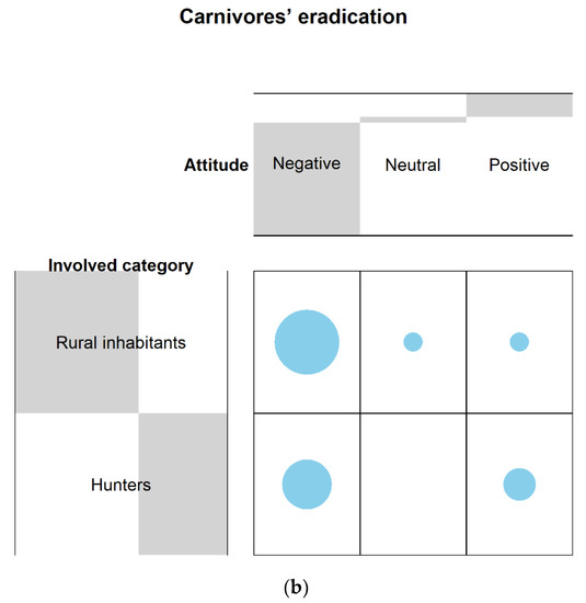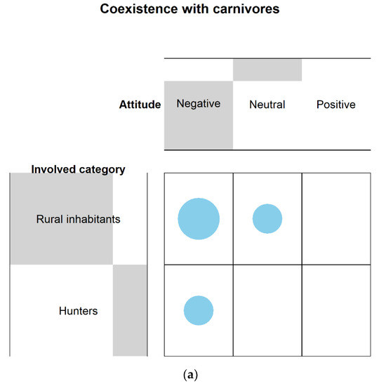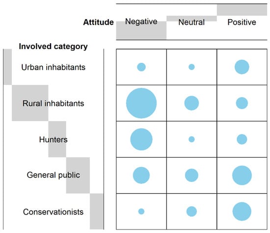 Contingency table showing the distribution frequency as far as the attitude towards carnivores of each category involved is concerned, i.e., urban inhabitants, rural inhabitants (mainly farmers and livestock owners), hunters, general public, conservationists. The size of the grey bars depends on the number of responses obtained by each stakeholder category for each attitude. For instance, from the above figure we see that the grey bar for rural inhabitants is the largest. This is because the highest number of responses were obtained (negative = 27, neutral = 6, positive = 4). On the contrary, the grey bar for urban inhabitants is the smallest as the lowest number of responses were obtained (negative = 2, neutral = 1, positive = 6). As far as the attitude is concerned (i.e., negative, neutral, positive), the criterion is the same. The negative attitude is that one which showed the larger grey bar as was that one mentioned the most by all stakeholders (urban inhabitants = 2, rural inhabitants = 27, hunters = 14, general public = 8, conservationists = 1). Contrarywise, the neutral attitude showed the smallest grey bar as the lesser mentioned by the stakeholders (urban inhabitants = 1, rural inhabitants = 6, hunters = 1, general public = 5, conservationists = 3). Reference list: [22,23,34,35,36,37,38,39,40,41,42,46,47,51,52,53,54,55,56,57,58,59,60,61,62,63,64,65,66,67,68,69,70,71,72,73,74,75,76,77].
