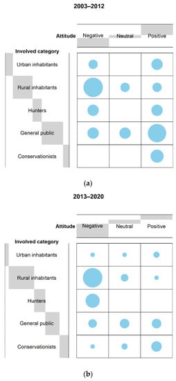 We found that the attitude of the categories involved changed between periods (2003–2012 and 2013–2020), except for the general public whose attitudes remained neutral and conservationists whose attitudes remained positive. Indeed, the latter perceived the return of such predators as a positive point to re-establish and maintain ecological balance and to prevent the disruption of ecological systems [25,26]. The attitude of rural inhabitants remained negative in both periods, becoming even more negative during the second, while hunters’ attitude changed from neutral in the first period to negative in the second one. Urban people showed a positive attitude during the first period changing to neutral during the second. We interpreted such changes as being that urban residents find it easier to support the large carnivore’s return and conservation in areas where they had been eradicated because they did not experience interactions with them [57,63]. Indeed, these results are in line with findings presented by Dressel et al. (2015) [33], who compared the attitude of peoples towards both bears and wolves in Europe from 1976 to 2012.