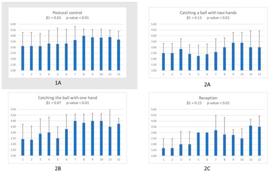 Fortnightly means and SD for postural control (1A) and the three eye-motor variables: catching and throwing a ball with two hands (2A), catching and throwing the ball with one single hand (2B), and reception of different objects (2C). Significant improvements were observed in all variables (p < 0.01).
