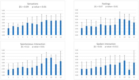 Figure 2 shows the mean and SD of the items from the dimension “Language and communication.” These variables were the expression of sensations, expression of feelings, spontaneous interaction, and spoken interaction. Results showed a statistically significant improvement (p < 0.01) in all variables but spoken interaction (p = 0.511).