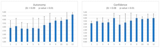 The last two variables were autonomy and confidence. Results for these two variables are reported in Figure 3. Mixed model results showed a significant improvement for the two variables (p < 0.01).