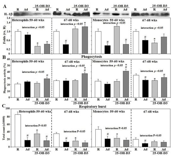 In contrast to R-hens, freshly isolated heterophils at 67–68 weeks and monocytes at both 59–60 and 67–68 weeks from Ad-hens had lower IL-1β secretion (p < 0.05, Figure 2A). Supplemental 25-OH-D3 suppressed heterophil IL-1β secretion in both R- and Ad-hens at 59–60 weeks and in Ad- and R-hen monocytes at 59–60 and 67–68 weeks, respectively, but increased heterophil IL-1β secretion in Ad-hens at 67–68 weeks. Ad-hen monocytes had a lower phagocytic activity at 67–68 weeks and supplemental 25-OH-D3 increased the phagocytosis of Ad-hen heterophils and monocytes at 67–68 weeks and at 59–60 weeks, respectively (p < 0.05, Figure 2B). Ad-feed intake also significantly suppressed respiratory burst response in both types of leukocytes at 59–60 and 67–68 weeks (p < 0.05), which 25-OH-D3 did not alter in Ad-hens. This same variable was significantly decreased in R-hen heterophils and monocytes at 59–60 and/or 67–68 weeks (p < 0.05, Figure 2C) with 25-OH-D3 supplementation. A significant interaction between Ad×25-OH-D3 treatments was observed in IL-1β secretion and phagocytosis of both cell types at 59–60 and/or 67–68 weeks, and in the respiratory burst response of heterophils at 59–60 and 67–68 weeks (p < 0.05, Figure 2A–C).