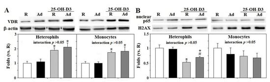 Ad-feed intake exerted no significant effects on VDR expression and p65 activation in both types of cells and supplemental 25-OH-D3 upregulated heterophil and monocyte VDR expression in both R- and Ad-hens, but suppressed heterophil p65 translocation (p < 0.05, Figure 4A–C). The results confirmed the inhibitory action of supplemental 25-OH-D3 on NFκB signaling in the animal model.