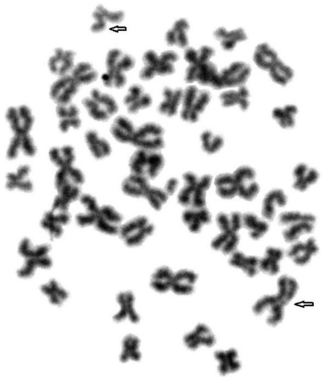 Figure 2. Fragile sites in the chromosomes of silver foxes. Damage marked with arrows.