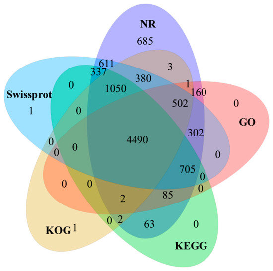 Comprehensive functional annotation of 11,033 full-length transcripts was performed by NR, SWISS-PROT, KOG, GO, and KEGG databases (Figure 1). A total of 9380 (85.02%) full-length transcripts were successfully annotated (E-value < 1 × 10−10) using at least one of the five databases. Among them, 9378 (85.00%), 8378 (75.94%), 6431 (58.29%), 6247 (56.62%), and 6734 (61.04%) full-length transcripts were annotated based on alignment to NR, SwissProt, KOG, GO, and KEGG databases, respectively. The remaining 1653 (14.98%) unannotated transcripts could represent other novel specific genes. In comparison to previously annotated fish transcripts in the NR database, our top five transcript hits included Lates calcarifer (16.3%), Larimichthys crocea (10.4%), Epinephelus coioides (9.0%), Seriola dumerili (8.7%), and Seriola lalandi (4.8%).