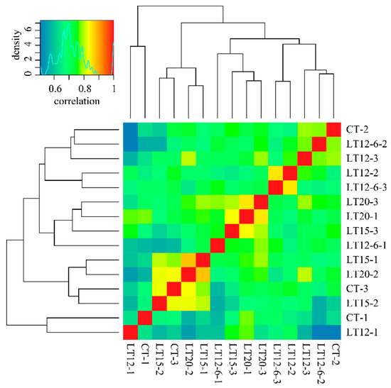 The expression matrix data of all transcripts in samples were standardized by FPKM and used for correlation analysis and differential expression analysis. The correlation coefficients of three repeated experiments in each group mainly ranged from 0.6 to 0.9 (Figure 2). A total of 105.65 Gbps clean reads (Q30 > 92.49%) were obtained after filtering the 106.33 Gbps ambiguous raw reads. As illustrated in Table 2, its GC contents ranged from 48.87% to 50.06%, and the error rate per sample was below 0.05%. Among the 15 samples, the base number of clean reads ranged from 21,798,947 to 27,220,097, of which a range between 75.75~79.59% reads was successfully mapped to the full-length transcripts obtained using SMRT-Seq. Of these mapped reads, the multiple mapping rate ranged from approximately 64.21~68.48%. The number of differentially expressed transcripts in each sample was 8405~8647.
