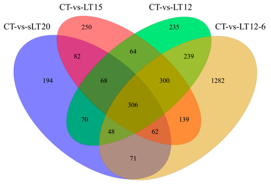 The DEGs were identified between different temperature experimental groups. As demonstrated in Figure 3, there were 901 (496 up- and 405 down-regulated), 1271 (725 up- and 546 down-regulated), 1330 (787 up- and 543 down-regulated), and 2447 (1243 up- and 1204 down-regulated) genes shown to be differentially expressed in comparison to CT vs. LT20, CT vs. LT15, CT vs. LT12, and CT vs. LT12-6, respectively (Tables S1–S4). According to the comparative analysis between control group and low temperature groups, 3410 differentially expressed genes were screened. The Venn diagram showed that four comparisons shared 306 DEGs. Notably, in the comparisons of LT20 vs. LT15, LT20 vs. LT12, and LT20 vs. LT12-6, there were a total of 431 (230 up- and 201 down-regulated), 799 (471 up- and 328 down-regulated), and 1956 (1064 up- and 892 down-regulated) DEGs, respectively. In addition, 668 (344 up- and 324 down-regulated), 1465 (762 up- and 703 down-regulated), and 1120 (577 up- and 543 down-regulated) DEGs were identified in comparison to LT15 vs. LT12, LT15 vs. LT12-6, and LT12 vs. LT12-6, respectively. These results showed that more DEGs were screened along with the decrease of water temperature and the extension of cold stress time.