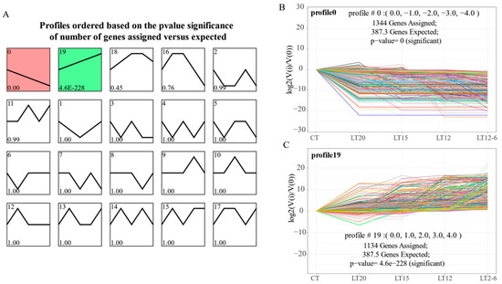 Statistically significant p-values were found in profiles 0 and 19, and they had more genes than other profiles (Figure 4A). As shown in Figure 4B, profile 0 had 1344 consistently down-regulated genes, and most of them were down-regulated at the LT20 group. In contrast, a total of 1134 genes were consistently up-regulated in profile 19 (Figure 4C), and most of them were up-regulated at the LT20 group. Subsequently, some genes maintained original expression levels after the first down- or up-regulation, whereas others were continuously down- or up-regulated in all gradient nodes.