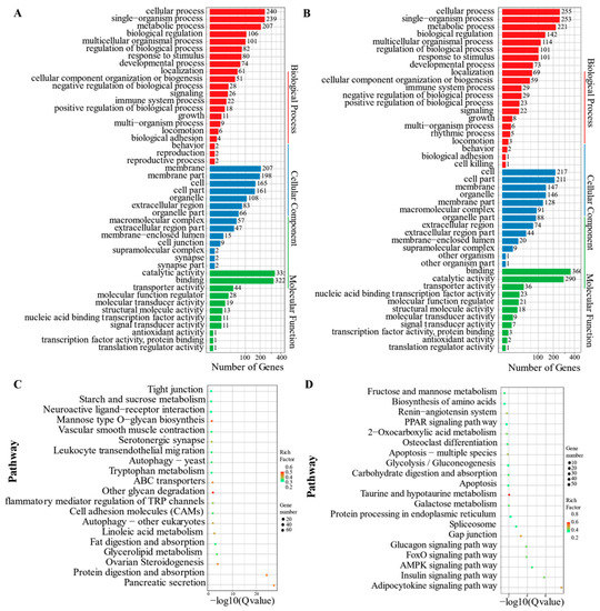 The KEGG pathway and GO enrichment analyses were performed on profiles 0 and 19 to assess the key biological processes and pathways linked with cold stress. As demonstrated in Figure 5, the main GO or KEGG terms observed in profiles 0 and 19 were similar. In the GO enrichment analysis (Figure 5A,B), different terms were represented. They included cellular process, single-organism process, metabolic process, biological body process, membrane, cell, cell part in cellular components, catalytic activity, and molecular function binding. On the other hand, the main enrichment pathways in KEGG were illustrated in Figure 5C,D. They included different signaling pathways, such as insulin, AMPK, FOXO, glucagons, and adipocytokine. The others included pancreatic secretion, protein digestion and absorption, ovarian steroidogenesis, and linoleic acid metabolism.