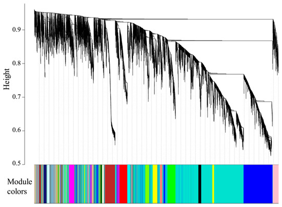 Cluster dendrogram of genes showing 23 modules identified by WGCNA. The cluster tree branches represent genes, and the genes with similar expressions were clustered in the same module (color).