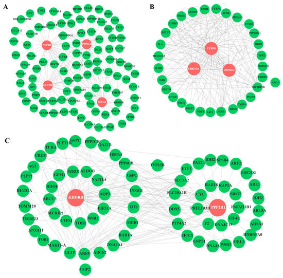 The PPI networks included turquoise, tan, and blue modules. (A) The PPI network of the turquoise module with 98 nodes and 200 edges; (B) The PPI network of ME tan module with 33 nodes and 200 edges; (C) The PPI network of ME blue module with 70 nodes and 200 edges. Hub genes were highlighted with red color as the background, and other genes were shown in green circles.