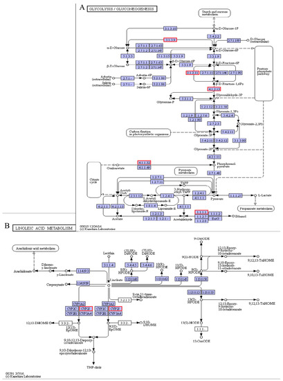 Glycolysis/gluconeogenesis pathway (A) and linoleic acid metabolism pathways (B).