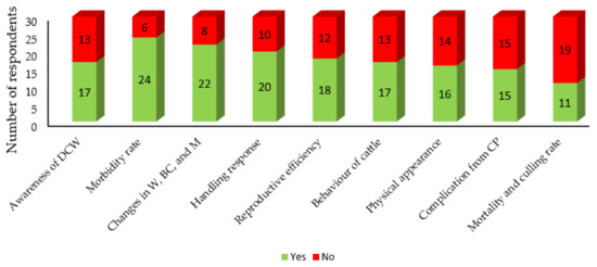 Respondents were asked whether or not they had heard of the term “dairy cattle welfare”. Only 17 (56.7%) had heard of the term before this study (Figure 1). Regarding the DCW criteria, the majority of the farmers selected morbidity rate (80%, 24/30), followed by changes in body weight, body condition and milk yield (73.3%, 22/30), and responses of animals to human handling (66.7%, 20/30). However, mortality and culling rate (36.7%, 11/30) and complications from common procedures (50%, 15/30) were the least considered criteria.