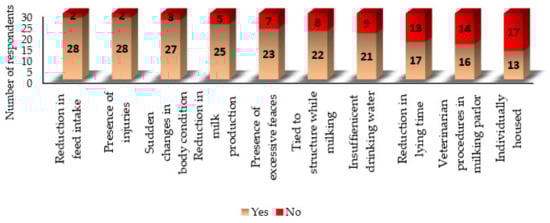 Figure 2 shows the farmers’ responses to the other 10 items considered as DCW criteria. Poor indicators of DCW that were the most recognized by the farmers were the presence of injuries (93.3%, 28/30) and reduction in feed intake (93.3%, 28/30) followed by sudden change in body condition (90%, 27/30). The least recognized indicators were isolation of cattle (43.3%, 13/30), carrying out veterinary procedures in the milking parlour (53.3%, 16/30), and reduction in lying down time (56.7%, 17/30).