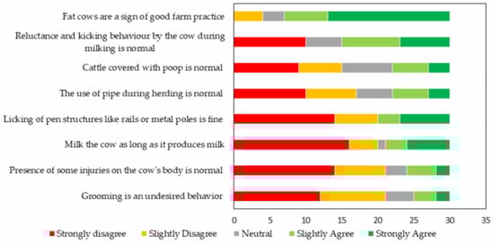 The majority of the respondents (60%, 18/30) disagreed with the statements about inappropriate practices and cattle behavior: 30% (9/30) gave a neutral response, and only 10% (3/30) agreed with the statements. Specifically, most of the respondents agreed with the statement, “Fat cows are a sign of good farm practice” and “Reluctance and kicking behaviour by the cow during milking is normal”. Meanwhile, the farmers slightly disagreed with the rest of the statements, but strongly disagreed with the statement, “Milk the cow as long as it produces milk”. Figure 3 shows the responses of the farmers arranged according to the proportions that disagreed with each statement.