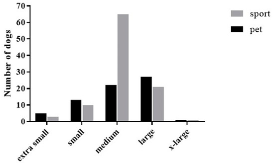 The dog ages for both groups were similar (pet dog: 5 ± 3; sports dog: 5 ± 2 years). The pet dogs were 57% female and the sports dogs were 52% female. A larger number of pet dogs were desexed (spayed/neutered: 87%) compared to the sports dogs (spayed/neutered: 64%). Pet dogs were 53% mixed breeds, but sports dogs were only 11% mixed breeds. More information about dog breeds is included in Supplementary Materials. The owners were asked about the size of their dogs. The median response was “medium sized.” The distribution of dogs per size category is shown in Figure 1.