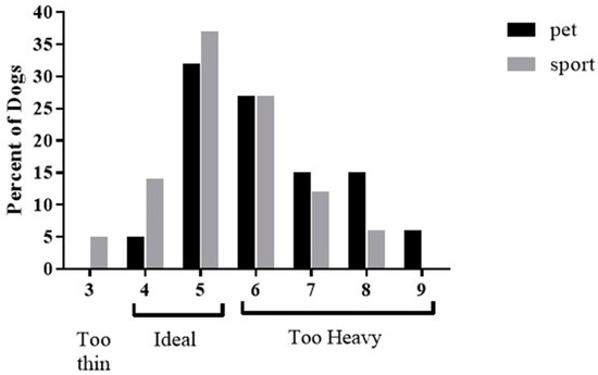 For the pet dogs, the median Purina body condition score was 6 (range: 4–9), but for the sports dogs it was 5 (range: 3–8) (p < 0.05 different from pet dogs). Using the Purina body condition scale, 78% of pet dogs were classified as “too heavy” (score of 6–9) compared to 45% for the sports dogs. See Figure 2 for a distribution of Purina body condition scores by group.