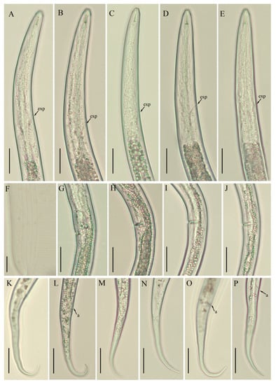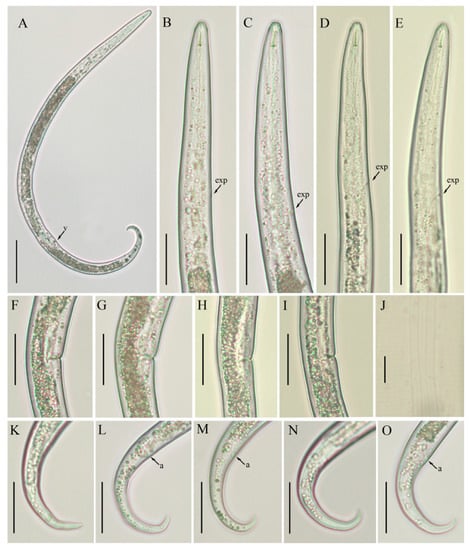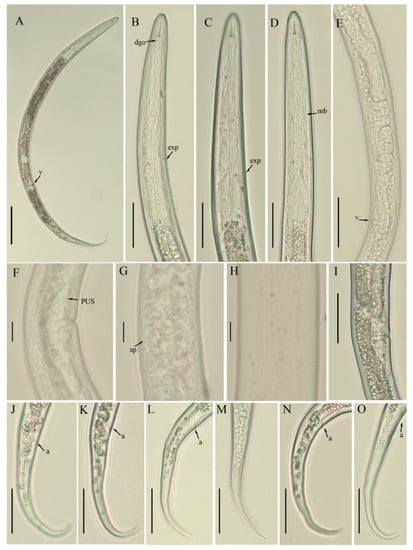 Photomicrographs of B. thylactus female, Canadian population 61. (A) Entire body; (B–D) pharyngeal region; (E) gonad; (F) vulval region; (G) spermatheca; (H) lateral lines; (I) vulval region; (J–O) tail regions. Scale bars: (A) 50 µm; (B–E,I–O) 20 µm; (F–H) 5 µm. Arrowheads: (a) anus; (exp) excretory pore; (dgo) dorsal esophageal gland orifice; (mb) median bulb; (sp) spermatheca; (PUS) post uterine sac; (v) vulva.
